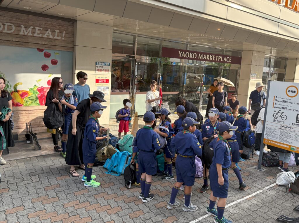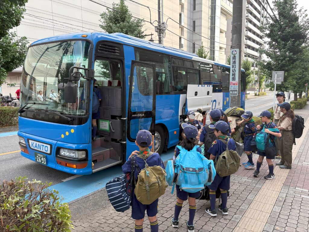 8月9日朝 南浦和駅西口に集合して、全員バスに乗車し出発しました。初日は天気は良くて晴れ間も見えていましたが、2日目から4日目まで、ほとんど雨に降られたキャンプでした。ビーバー隊やカブ隊はプログラムの変更をして、屋内でのプログラムが多くなりましたが、ボーイ隊は強い雨の中での野営になりました。