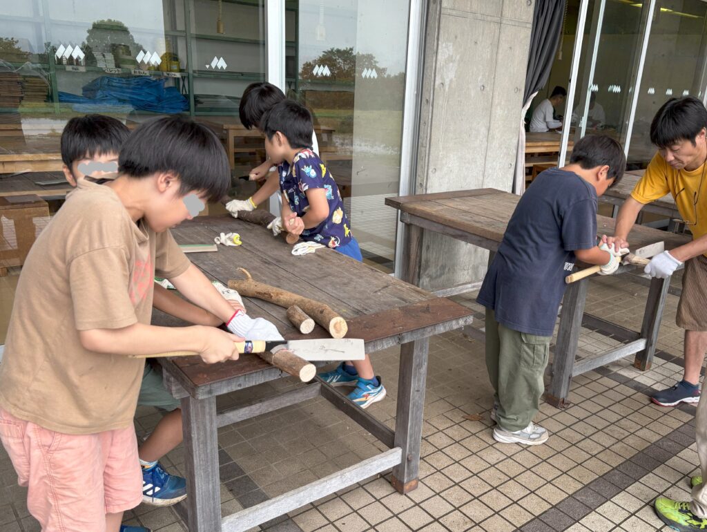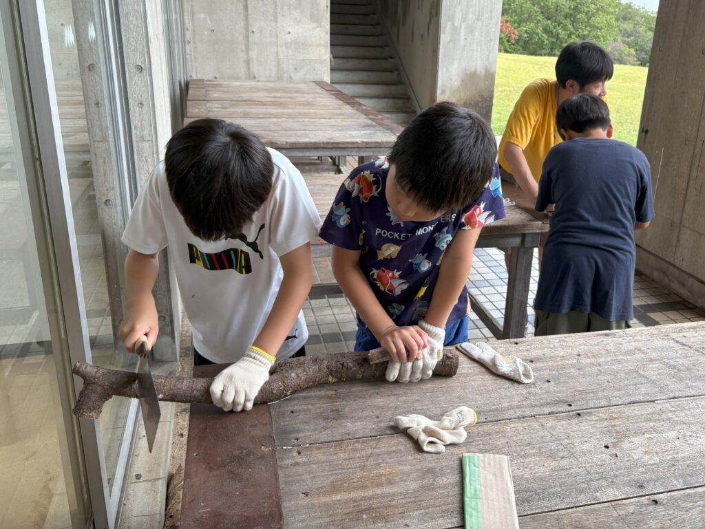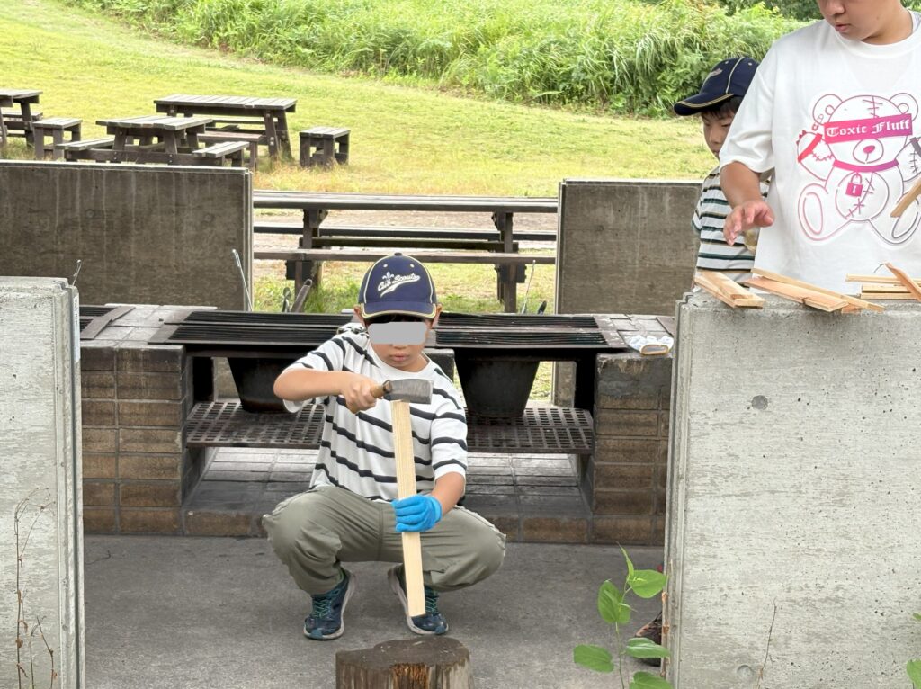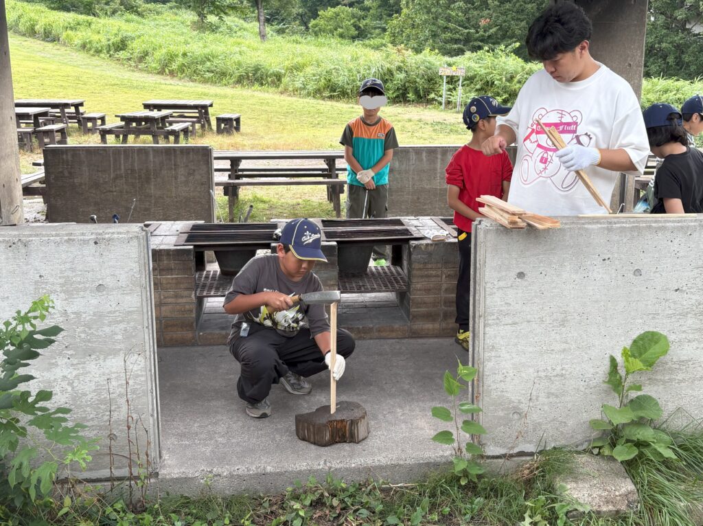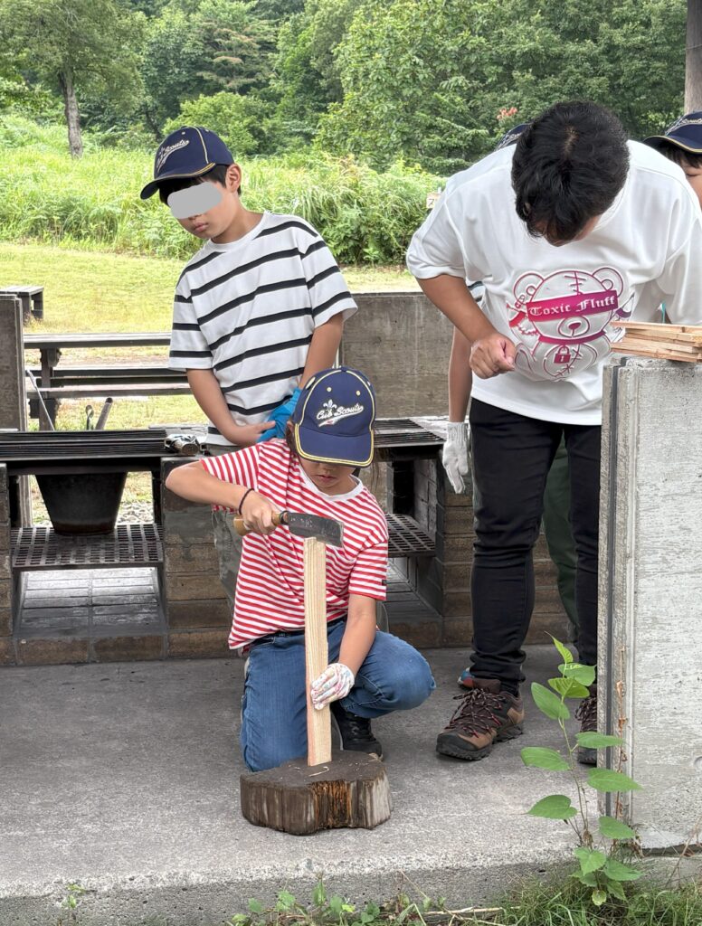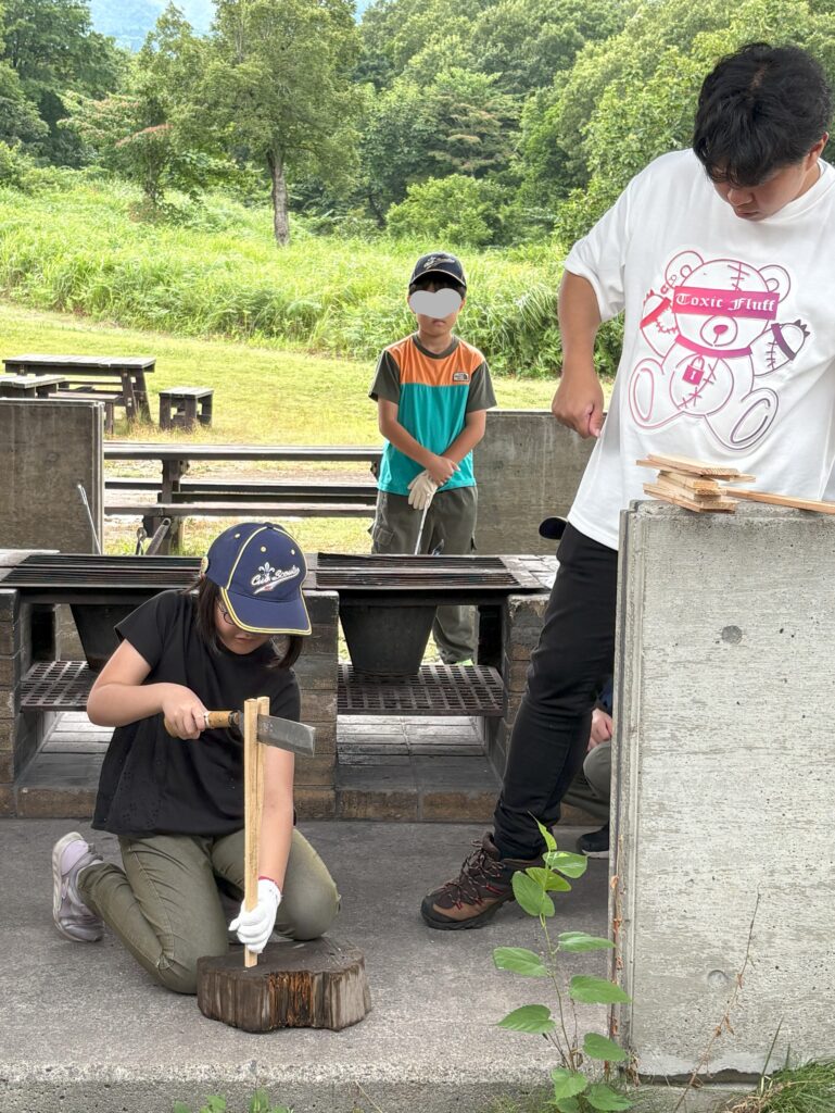 リーダーに教えてもらい、薪割に挑戦です