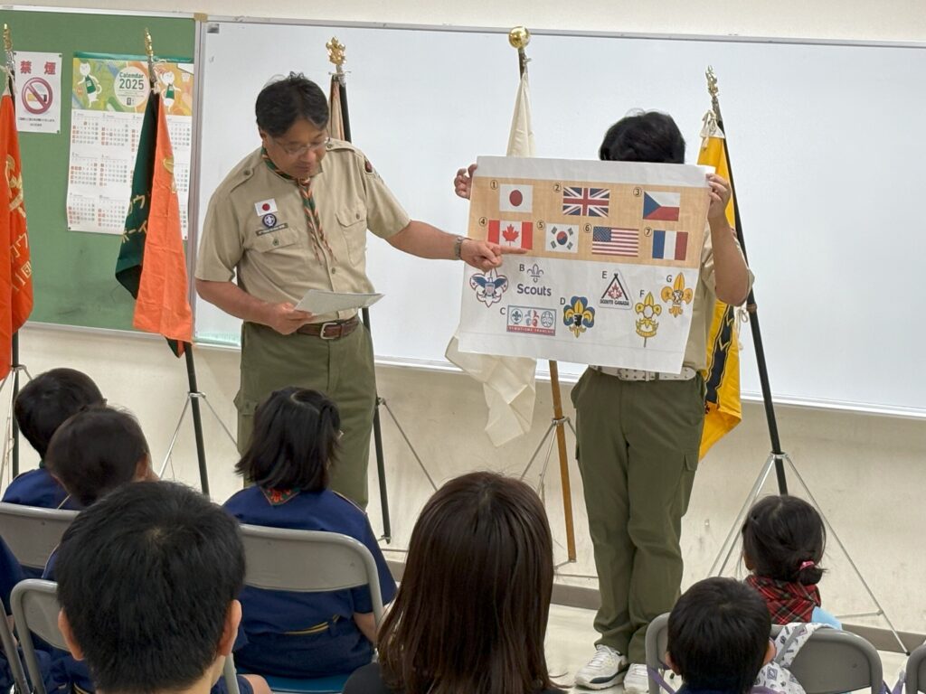 今回の「入隊上進式」では、まず育成会長のご挨拶をいただきました。育成会長のお話の中で世界のボーイスカウトのスカウト章を紹介していただきました。