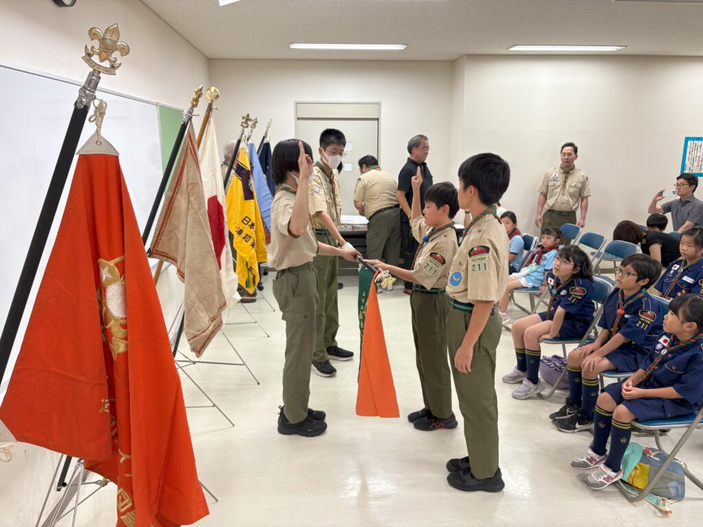 今回は、ビーバー隊2名、カブ隊3名の新しい仲間が増えて、みんなに「やくそく」しました。