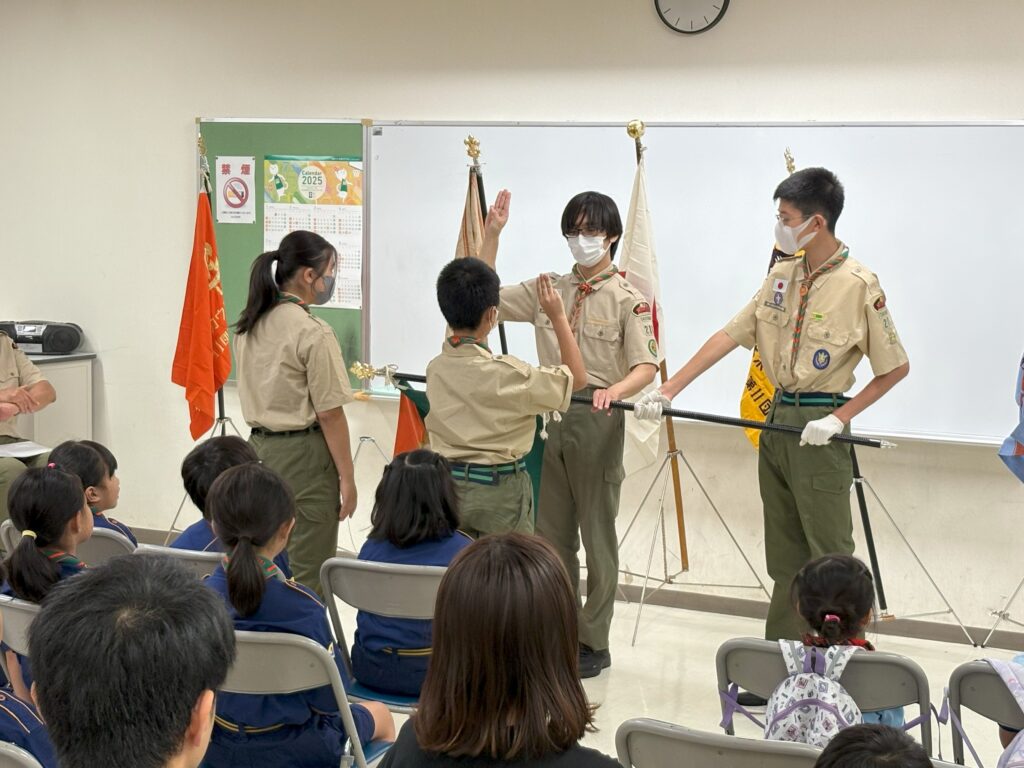 朝のセレモニーで、今月もビーバー隊に新しい仲間が入隊しました。